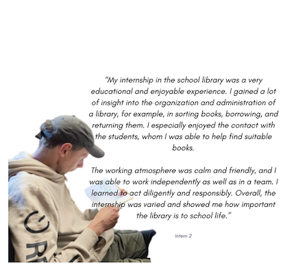 The prospect of a so-called externalised job following an internship was also discussed. With a keen eye for opportunities, Ms. Frübing opened this door for his intern. As a result of the project, he is now undertaking a second internship to gain experience, build further contacts, and thus facilitate the transition. This is further aided by the fact that, thanks to the current Berlin school law, all new school buildings must be equipped with a school library. These libraries require staff, because a room alone does not make a library. Certainly not one that serves as a “community hub”—a place for learning, working, and meeting.